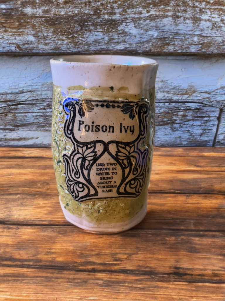 Step into the apothecary of curiosities with this whimsical Poison Ivy Tumbler. Glazed in earthy greens with a textured surface that feels as wild as the vine itself, this cup is adorned with a vintage-style poison label that warns: “Use two drops in water to bring about a terrible rash.”