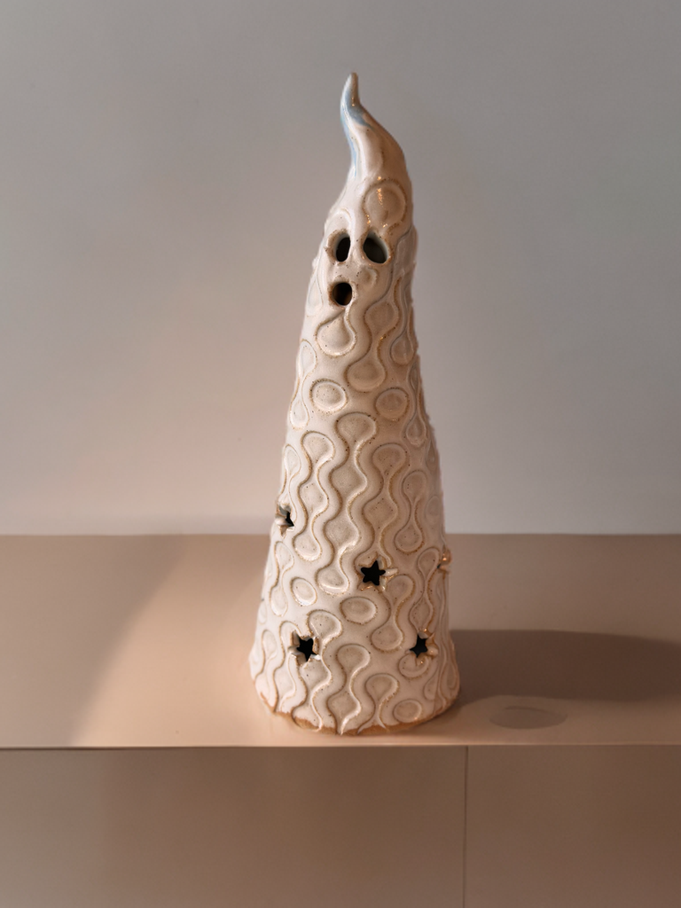 Hand-built from clay slabs, each ghost is sculpted into a tall, twisting form with a unique expressive face. The surface is pressed with rolling textures to create flowing, wavy designs before being cut with tiny stars for glowing light play. Once dried, it’s bisque-fired, then glazed in soft ivory and pearly tones for a luminous effect. Fired again at 2300°F, it becomes sturdy, heirloom-quality pottery—safe for years of seasonal enjoyment.